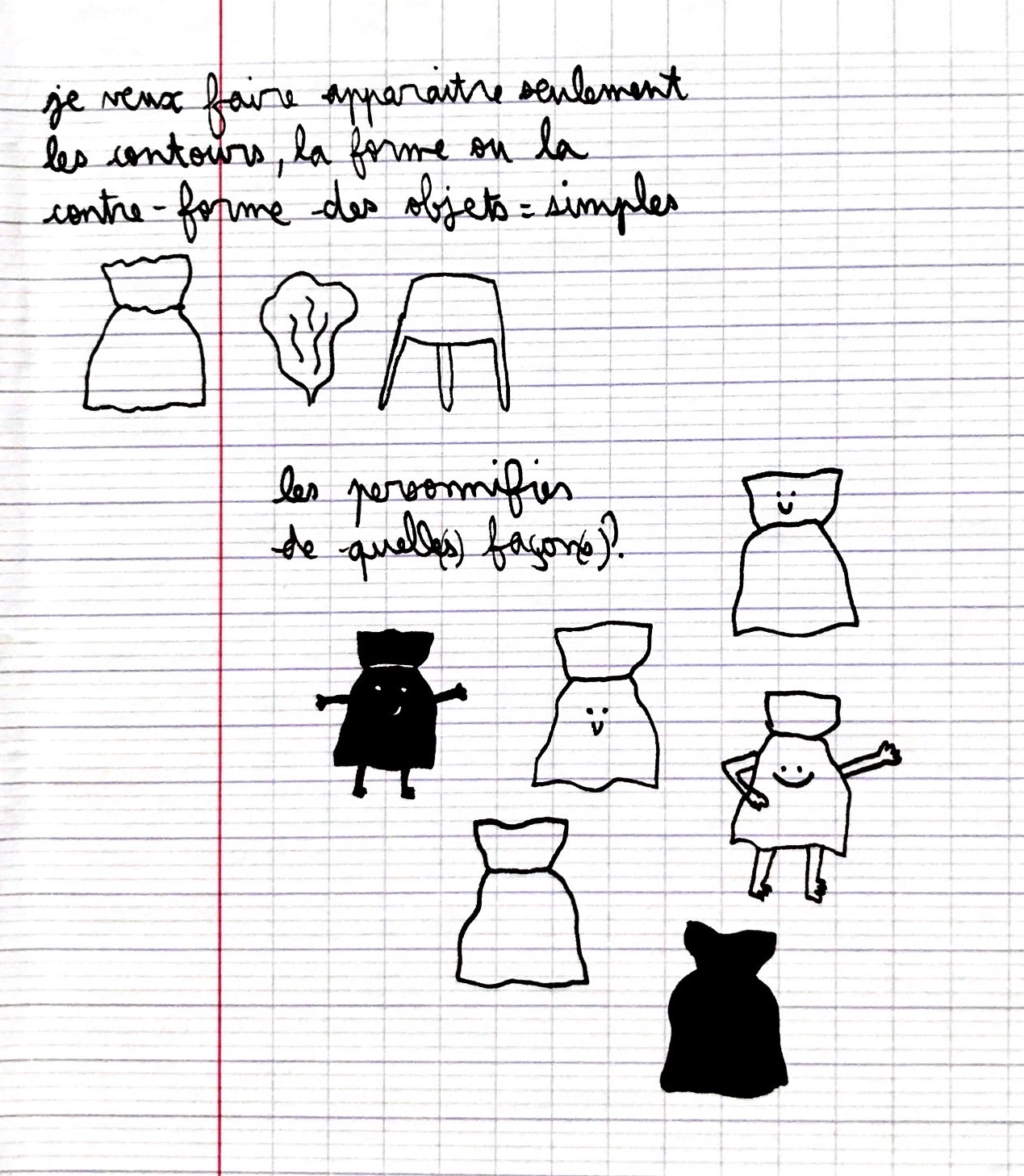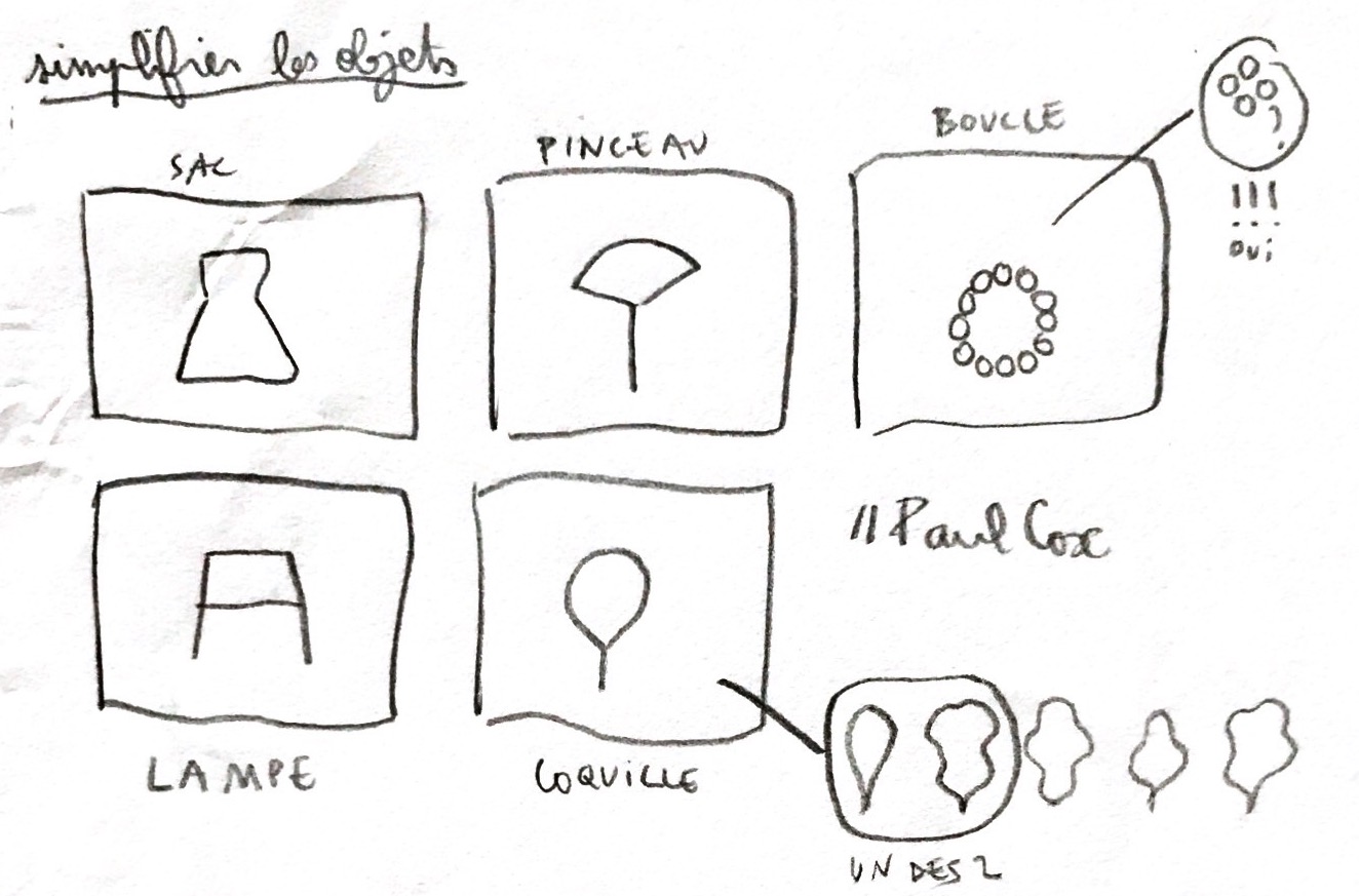 j'ai voulu simplifier mes objets car je ne voulais pas que mes dessins soient réalistes, je voulais qu'on puisse dessiner mes objets en deux secondes, pour permettre une aisance dans la réutilisation de mes scénarios.
