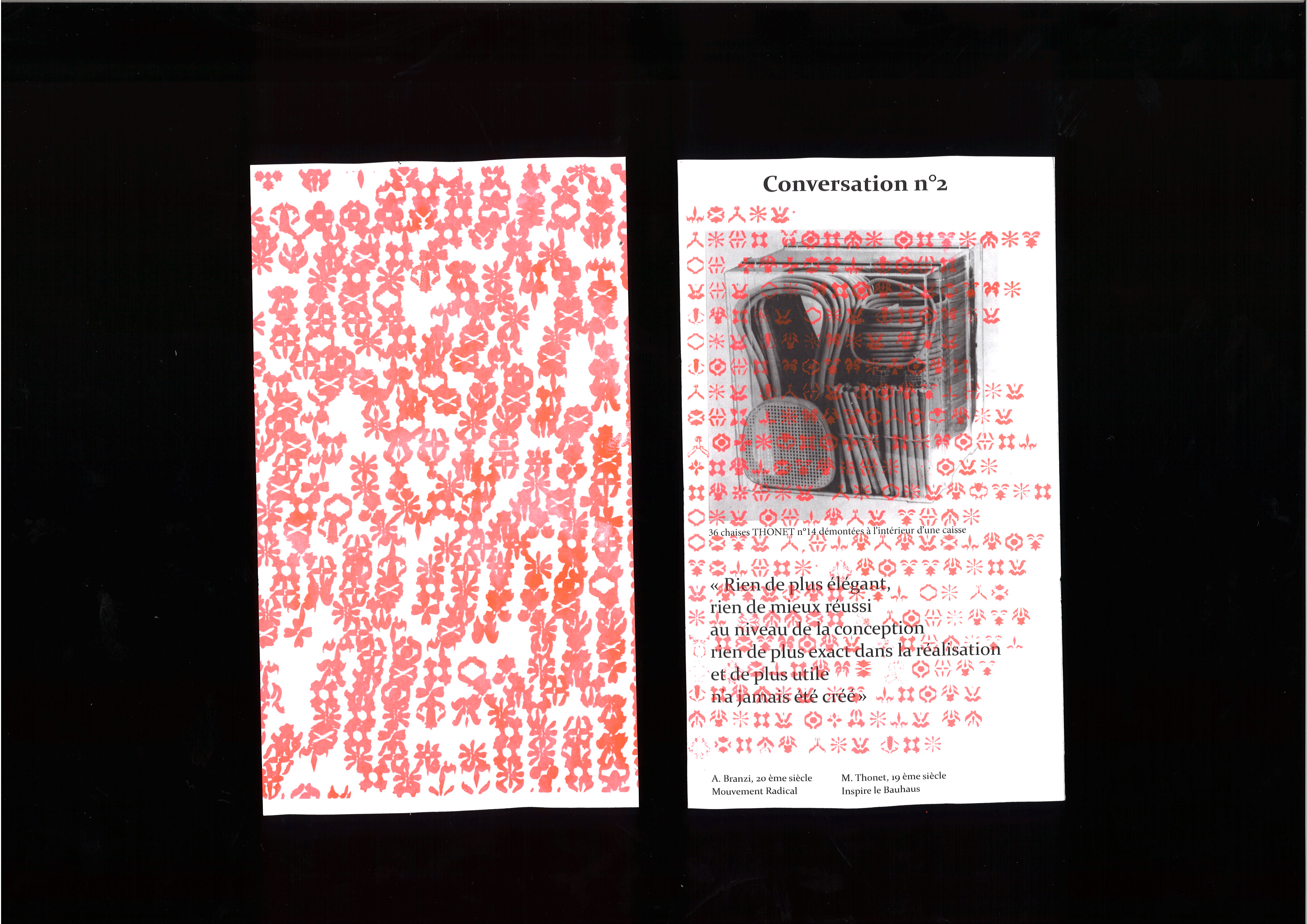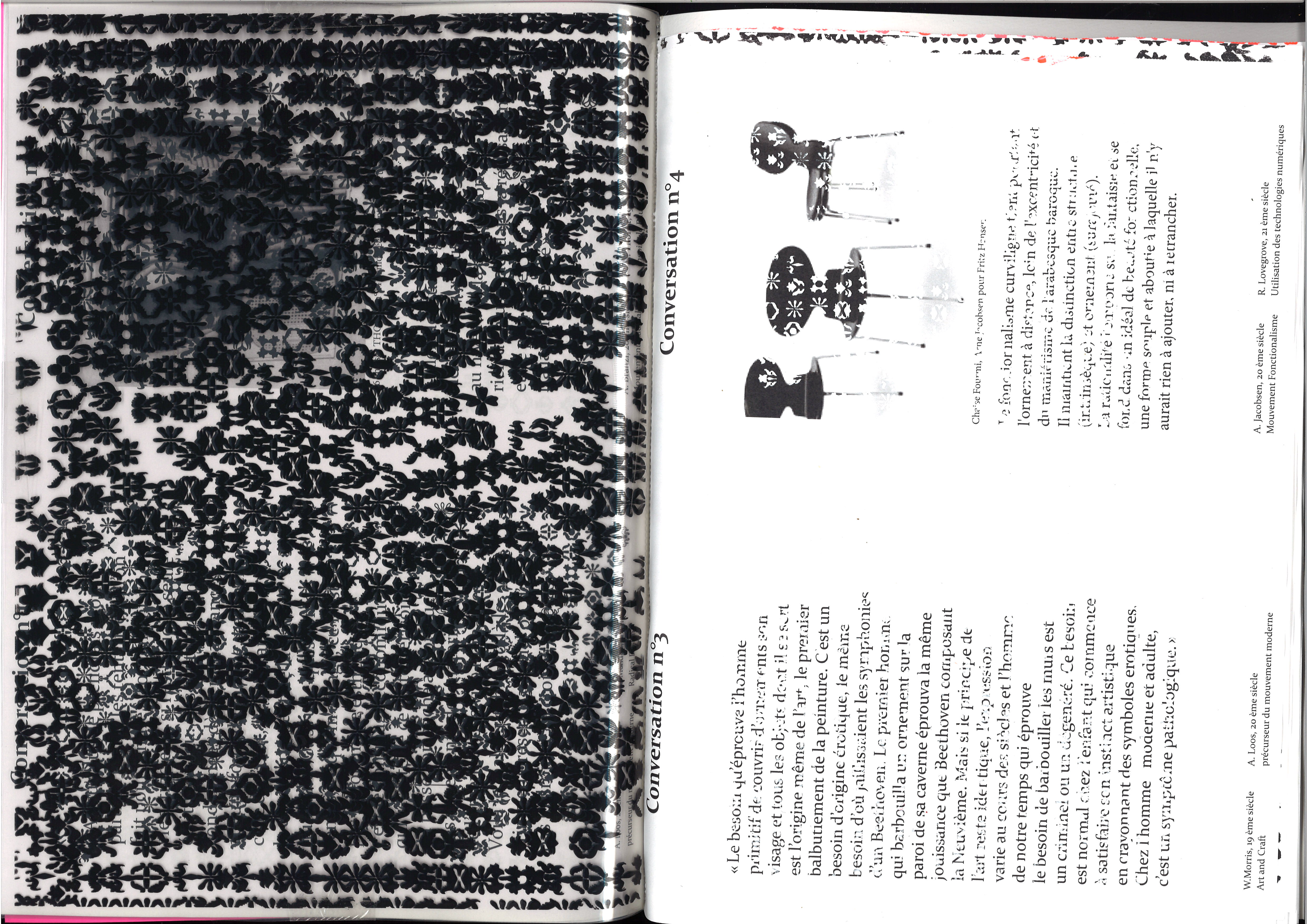Le débat et la discussion sont au coeur des interactions humaines. Lors d'un débat, les avis fusent ce qui créer souvent un brouhaha incessent qui ne laisse pas de place au silence, au vide. Dans l'histoire de l'art et du design l'ornement fait débat, adopté puis décrié, il est depuis longtemps le sujet de beaucoup de discussions. L'ornement est partout, et ce depuis toujours, cette tendance est invariables dans l'Histoire de l'art. Que ce soit par les arabèsque des peuple Arabes, en passant par les tapisserie de Wiliam Morris ou les ornements exubérants du style Gothique, c'est un fil conducteur qui reflète aussi la société dans lequel il se place. Pourtant l'ornement à aussi été réfuté nottament par Michel Thonet puis par Adolf Loos et le mouvement Bahaus qui refute avec une certaine violence “l'instinct d'orner”. Pourtant, il ré-apparait avec le mouvement post moderne mais aussi, depuis peu, avec l'arrivé des nouvelles technologies avec des artistes comme Rose Lovegrove qui s'inspirent de la nature pour créer via des imprimantes 3D.