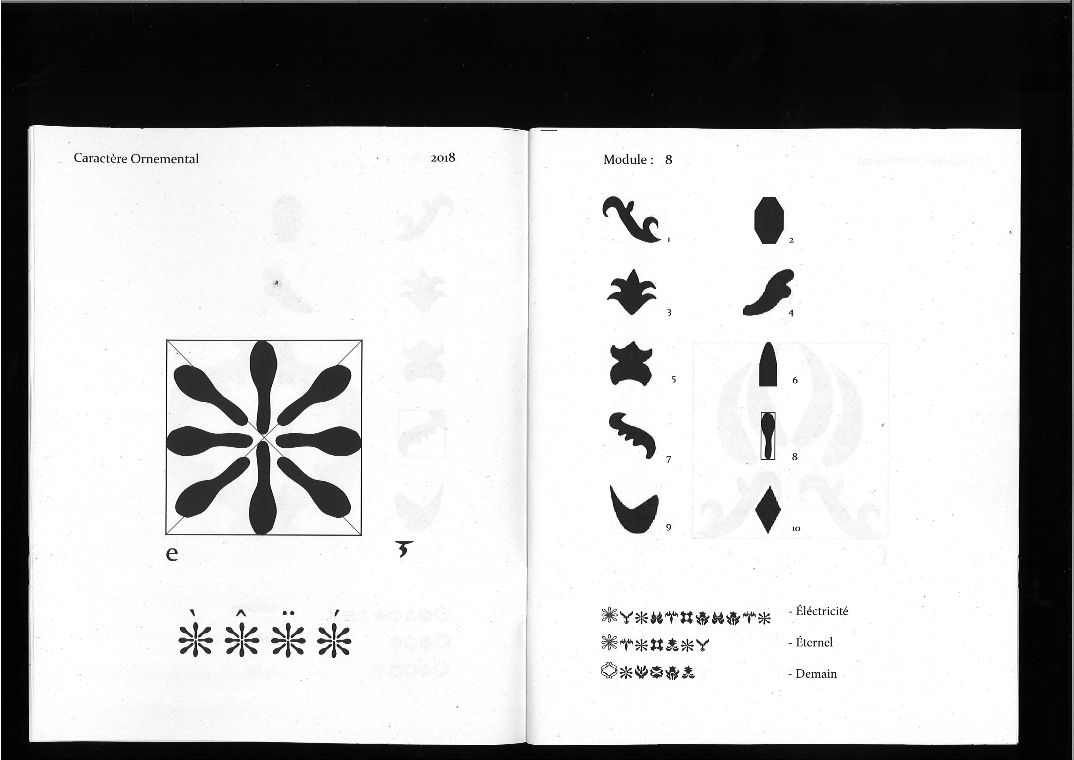 Le caractère à été créé à partir de module prélevés sur les motifs du musée Borely. Ils sont ensuite ré-agencés pour en faire un caractère à part entière. Ce caractère va me permettre de générer des textes critiquant l'ornement. Ainsi, on se retrouve avec une typographie non lisible mais déchiffrable.