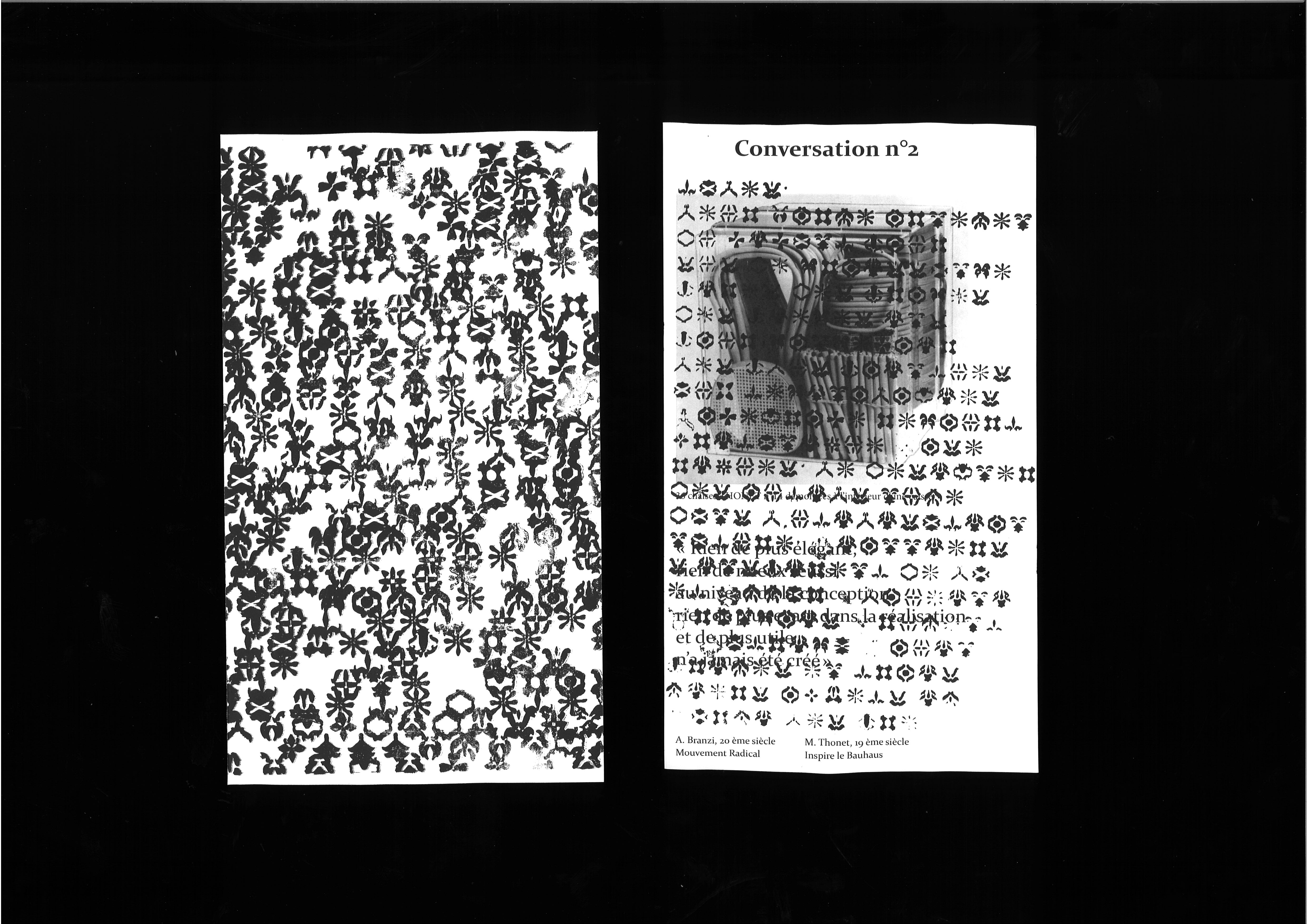 * Des textes sérigraphiés venant recouvrir les arguments “pro-ornement” dans le caractère non lisible créé grâce à Calligraphr.