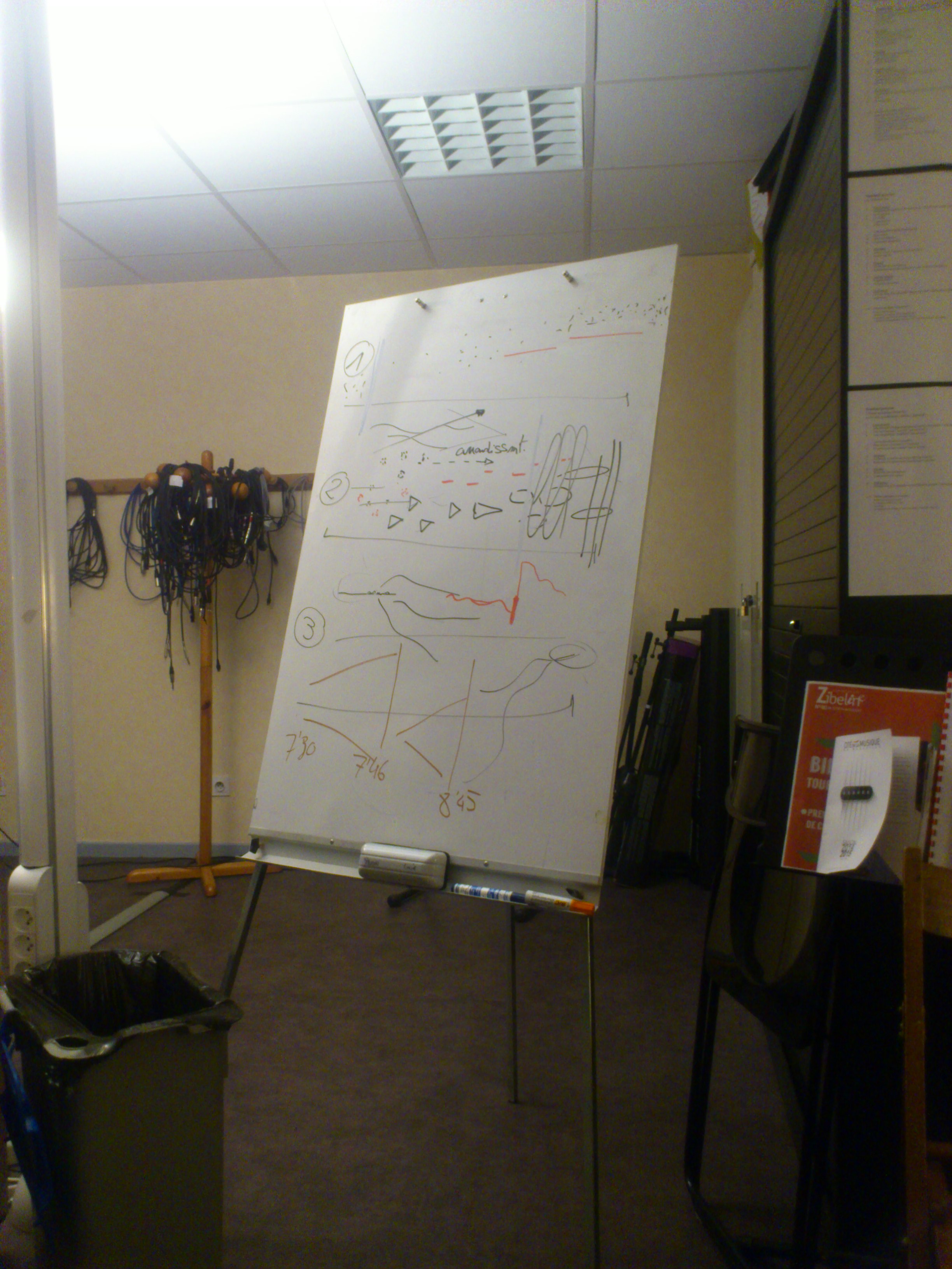 Chaque étudiant définit son projet et ses contraintes car Maxime affirme que la composition c'est faire des choix. Chaque étudiant présente aux autres les intentions artistiques ou les contraintes techniques qu'il se fixe en s'aidant d'un tableau Veleda et quelque feutres de couleurs. Un des étudiants a présenté la pièce mixte (un enregistrement + un instrument) qu'il voulait mettre en place : il dessine des ondes, ces ondes sont sous la terre, puis elle se transforment en racine, puis un tronc apparait, le tronc se sépare puis des branches foisonnent puis le ciel apparaît puis des étoiles. C'est pour lui un moyen d'appliquer une image à ses envies pour transmettre ses intentions plus facilement.