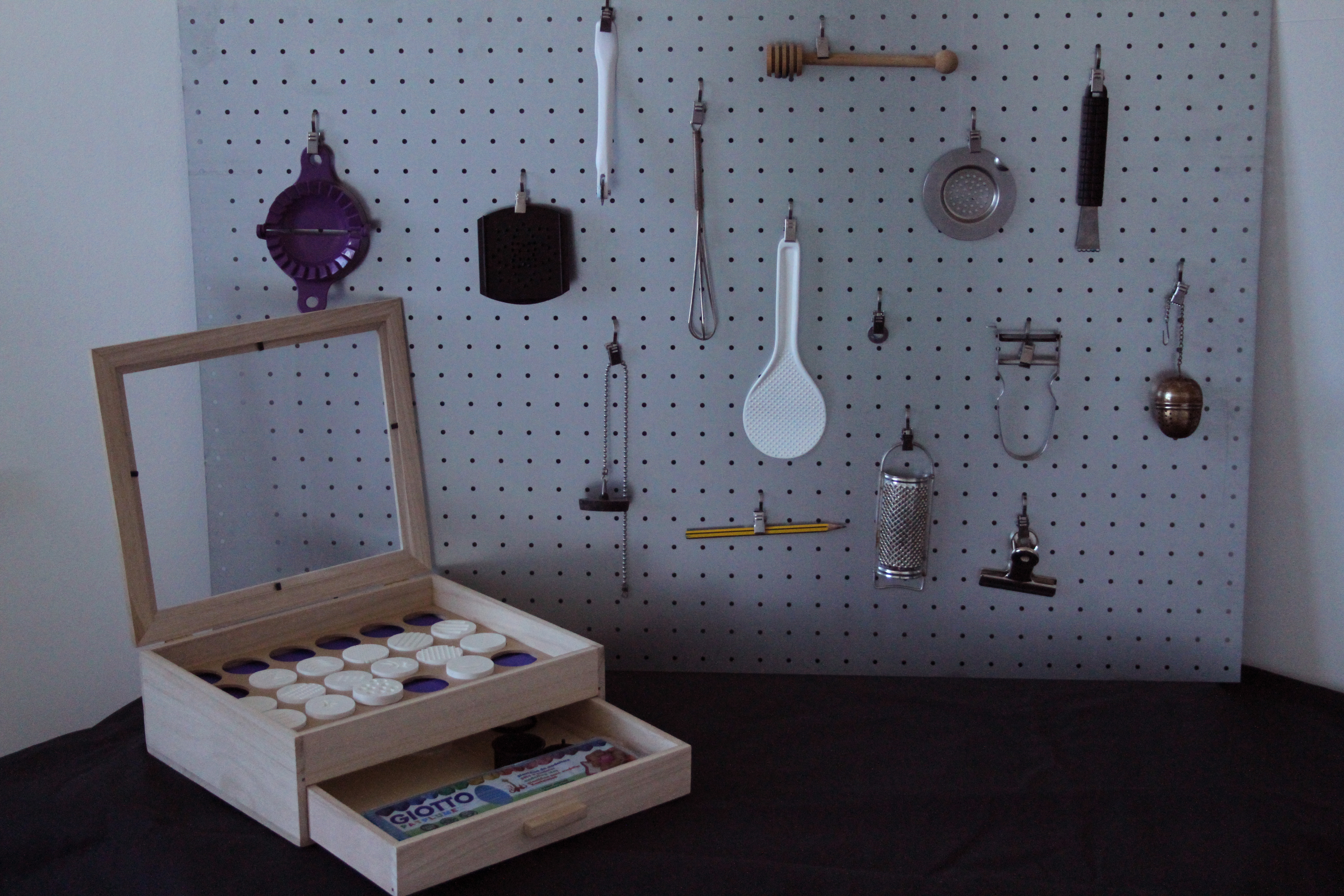 Le MACMUC est composé d'un ensemble d'outils concrets présents dans notre quotidien, un bloc de pâte à modeler et des formes imprimées en 3D. Cet atelier permet d'associer un outil, un geste et une empreinte à un type de son pour mémoriser cette typologie complexe.