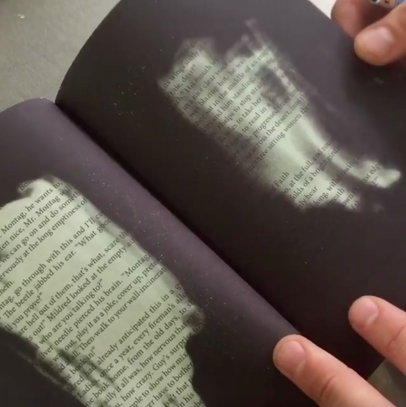 Remarque: que ce soit dans le principe de l'encre phosphorescente, qui n'apparaît que dans l'obscurité ou de l'encre thermo-sensible, qui disparaît à la chaleur, il y a un jeu de caché/ dévoilé.
